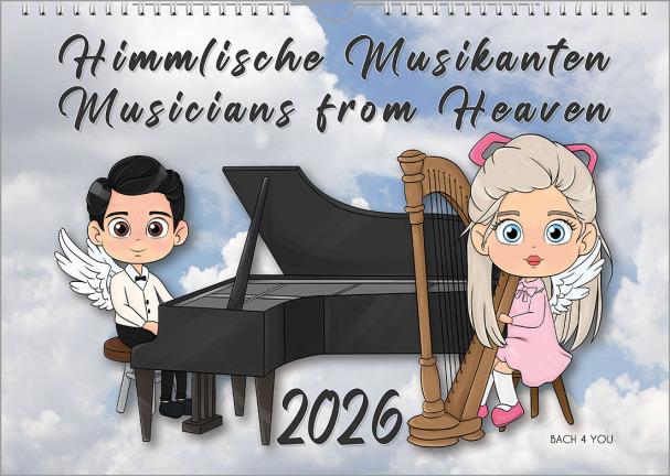 Gifts for musicians. So you are looking for gifts for musicians? Gifts for musicians for small music fans or those for big music fans? Hello, parents, grandparents, uncles and aunts, brothers and sisters, cousins and nephews: Does one of your kids already have a first contact to Classical Music or to music in general? Or is he or she learning to play a musical instrument? Here – in this ad – you could find really cool, special and stylish gift ideas. We – that's me with my tiny Publishing House Bach 4 You and my husband with his project Bach on Bach – we try to refinance our whole meanwhile huge "Johann-Sebastian-Bach Mission" a little bit and came – step by step – to the realization that calendars fit perfectly to the topic music: They are an educational support to get children even more excited about music. And with them, we can also perfectly ask you for your help to support my husband's project Bach on Bach and our common Mission: Oh yes ... and by the way, music calendars are also a nice decoration for your home or just ... a great gift for musicians.
